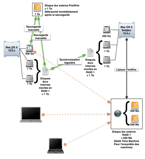 Ma machine, un Mac Pro, peut contenir 4 disques durs. J’ai un disque Système de 300 Go, qui contient mon compte utilisateur (fichiers, mails, développements…), mais j’ai rajouté deux disques de 1 To (1 ?000 Go) en RAID 1 (clonage en permanence) pour mes photos, vidéos, collection, musiques… Cet ensemble RAID est synchronisé sur un disque externe de temps en temps (1/mois environ) avec SilverKeeper. Ce même ensemble est "copié" sur le serveur par synchronisation.